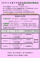114年11月臺中市東勢區社區癌症篩檢活動通知修正版 臺中市東勢區衛生所 2025-10-20 ★請攜帶健保卡,保護你我健康,建議配戴口罩參加。 ★查詢近期場次及當年度個人篩檢資格-電話:04-25873872#20...