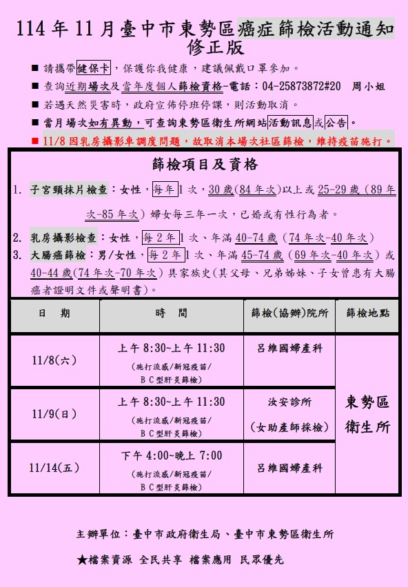 ★當月場次如有異動,可查詢東勢區衛生所網站活動訊息或公告。