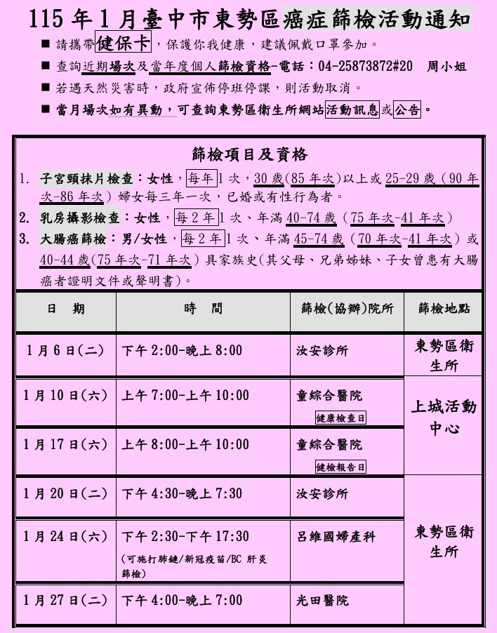 115年1月臺中市東勢區社區癌症篩檢活動通知