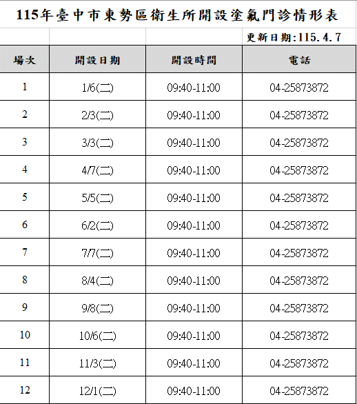 東勢衛生所於每月第一周周二上午9點40分-11點提供免費塗氟服務,請攜帶健保卡及兒童健康手冊於10點半前報到